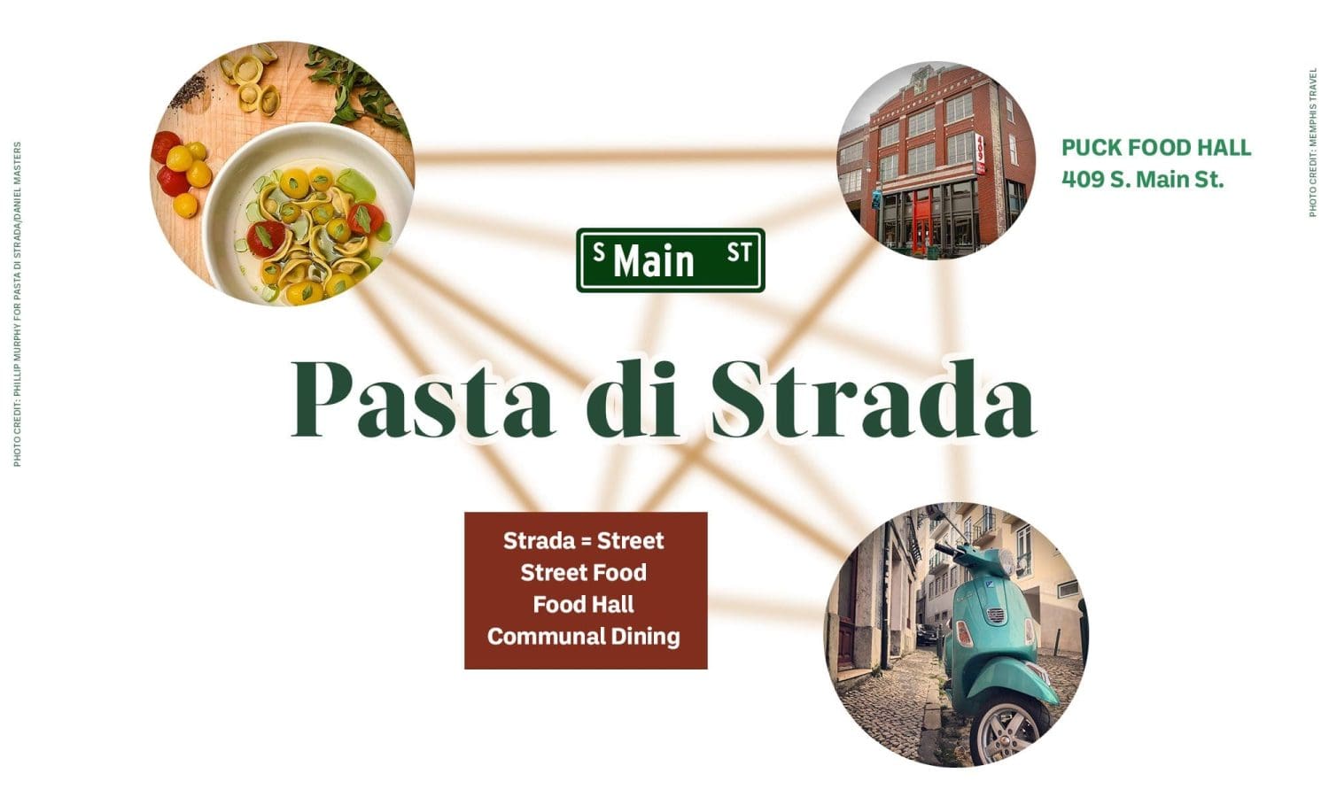 Editors Note: Sadly, Puck Food Hall, and thus, Pasta di Strada did not survive the economic conditions of the pandemic. We leave the portfolio study of this naming and logo design to demonstrate our capabilities and range.